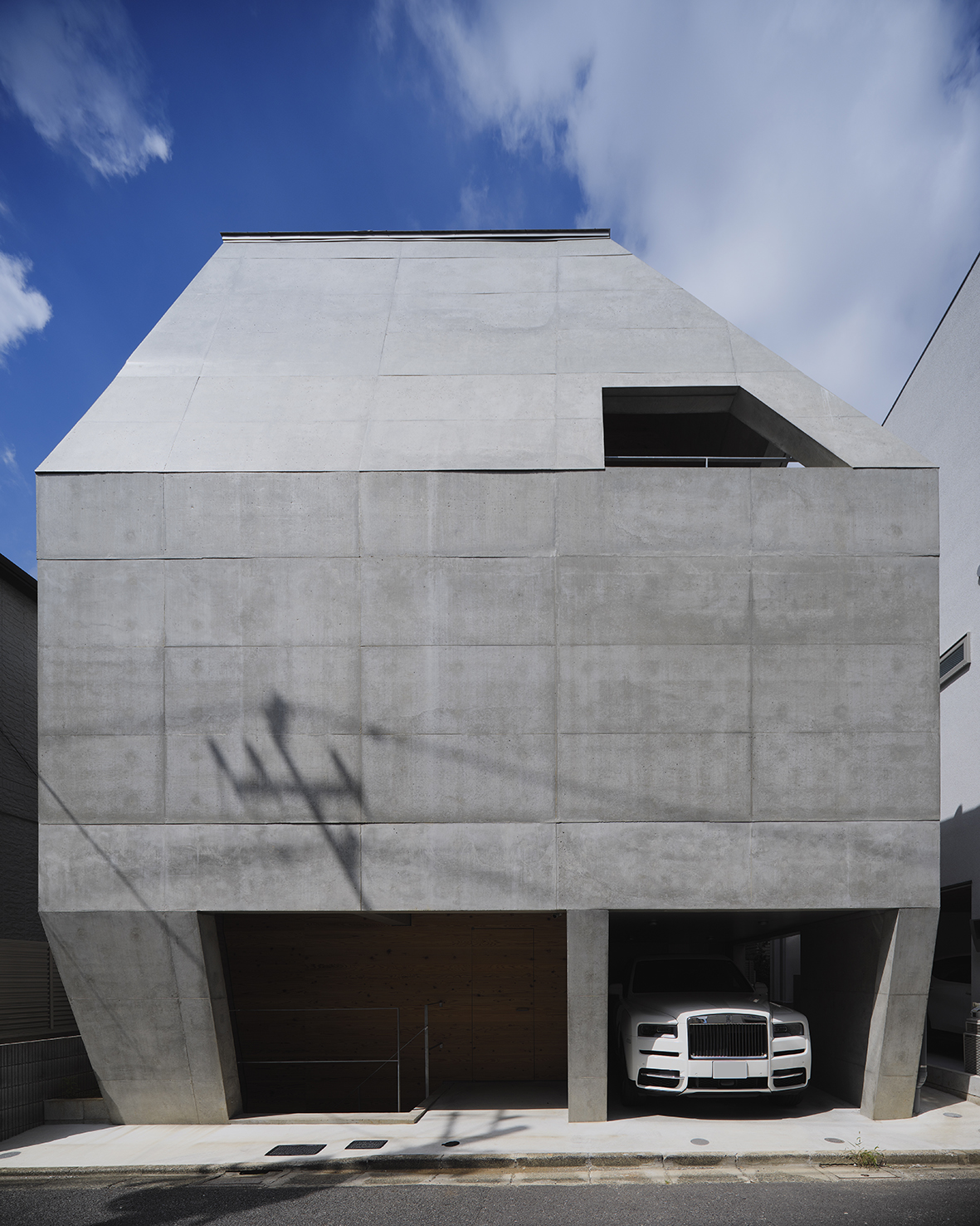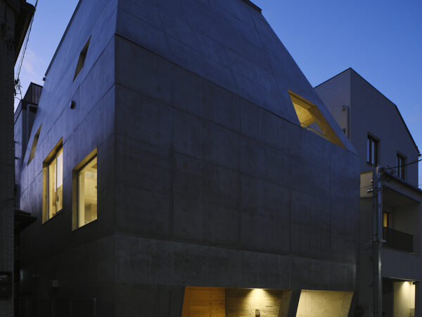 敷地は東京都心部の密集した住宅街に位置します。敷地内の空地を少しでも広げようと、また、空からの恩恵を少しでも受けようと、外壁をナナメに建てました。こうして岩石が今にも動き出しそうな造形がつくられています。