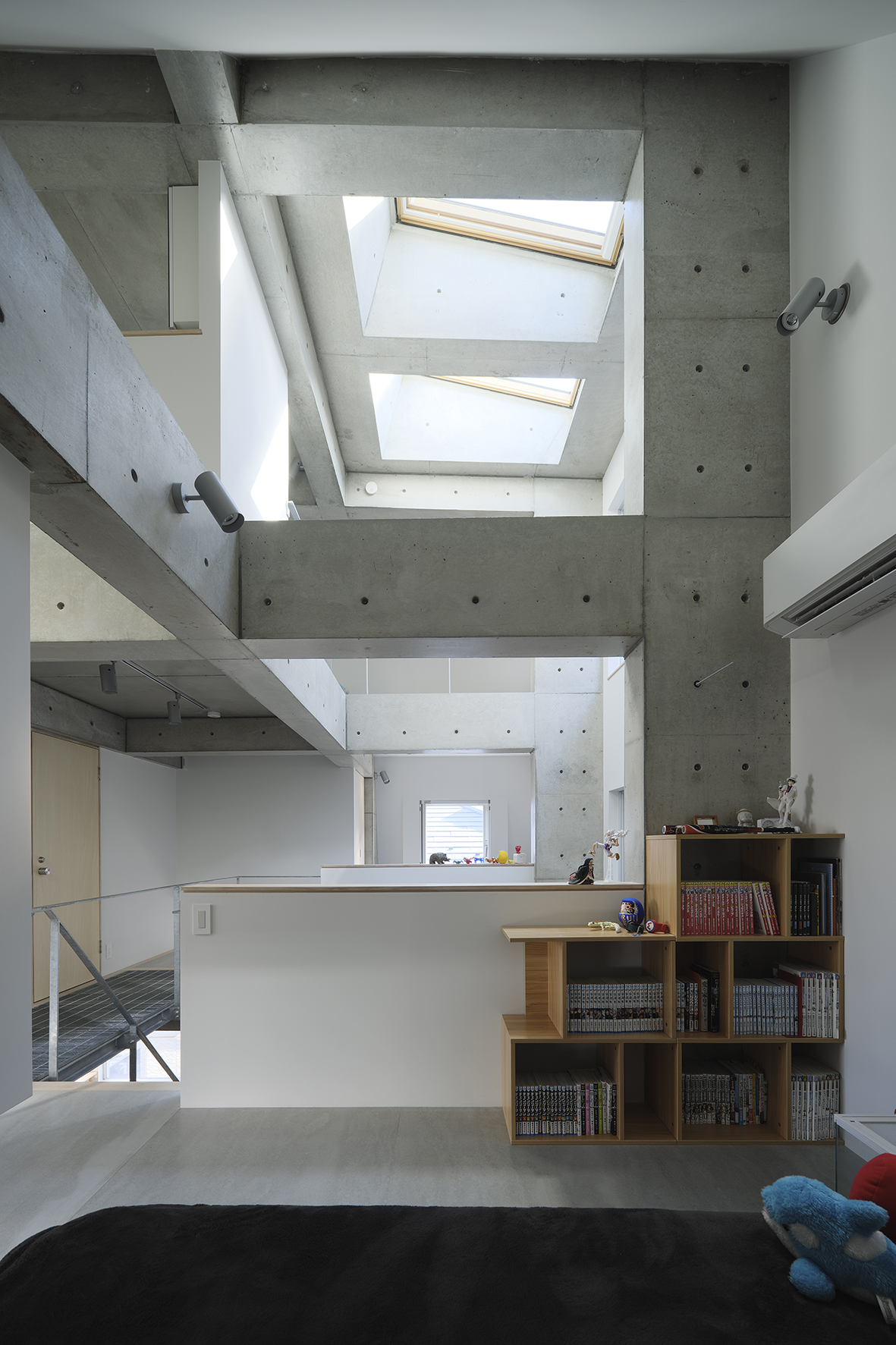 地上層を貫く洞穴のような吹抜けは、都市の確保しづらい空地を住宅内に取り込もうとしています。断面的にもひとつの大きな空間の中で、視線の抜け、家族の生活、さまざまな方向から享受される光や風を感じることができます。