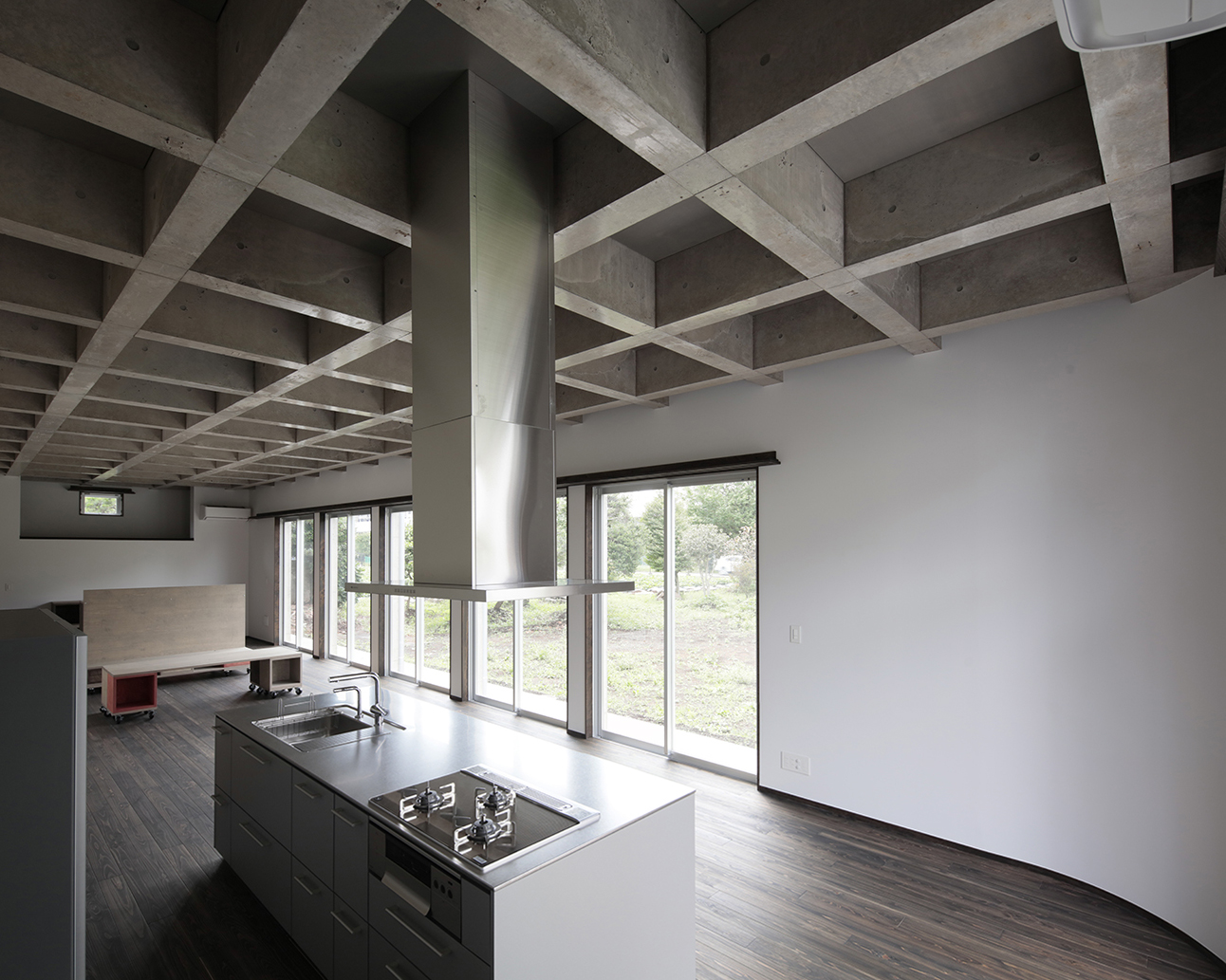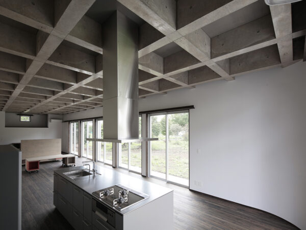 リビング空間は天井面をコンクリートの格子状の梁を用いることで、淡白な広い空間にならないように配慮し、柱のない大空間を実現しています。