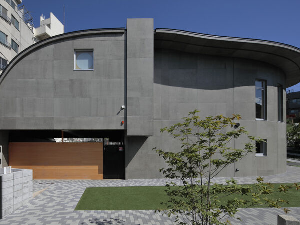 建築は敷地形状に合わせて弓なりの平面外形とし、屋根もゆるやかな曲面を描く。軒は深く出しむくりをつけ、既存の本堂と呼応しながら新旧の建物がたたずむ風景を期待した。西面の道路側は屋根の曲面がシームレスに壁となり地面に到達することで、ヴォリューム感を軽減する謙虚さと、曲面造形の主張を併せもつ表情をみせている。