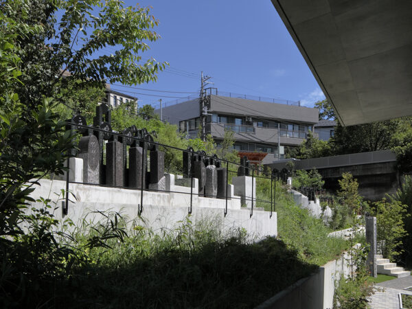 国分寺崖線に位置するこの敷地は、国分寺市から三鷹市までの東西に延びる「はけ」と呼ばれる崖地にあり、崖の中腹からは古来より重宝された地下水が湧き出ている。金蔵院は小金井市で最も古い寺院で、正門からは室町時代から参道だったであろう「はけの道」が始まり、一定の軸線をもっている。境内に隣接した西側の一団の土地を数年前に所有したことから、ここに新たに礼拝堂や納骨堂を建築する計画が始まった。外構では墓地、湧水を活用した小川、崖には八十八箇所巡拝路も計画された。八十八箇所巡拝路とは、四国にある弘法大師・空海ゆかりの88カ所の仏教寺院を巡礼するための道であり、いわゆる遍路のミニチュア版である。ほこらや踏み砂などの適切な設えをすることで、四国遍路を行ったのと同等の価値があるとされる。