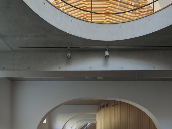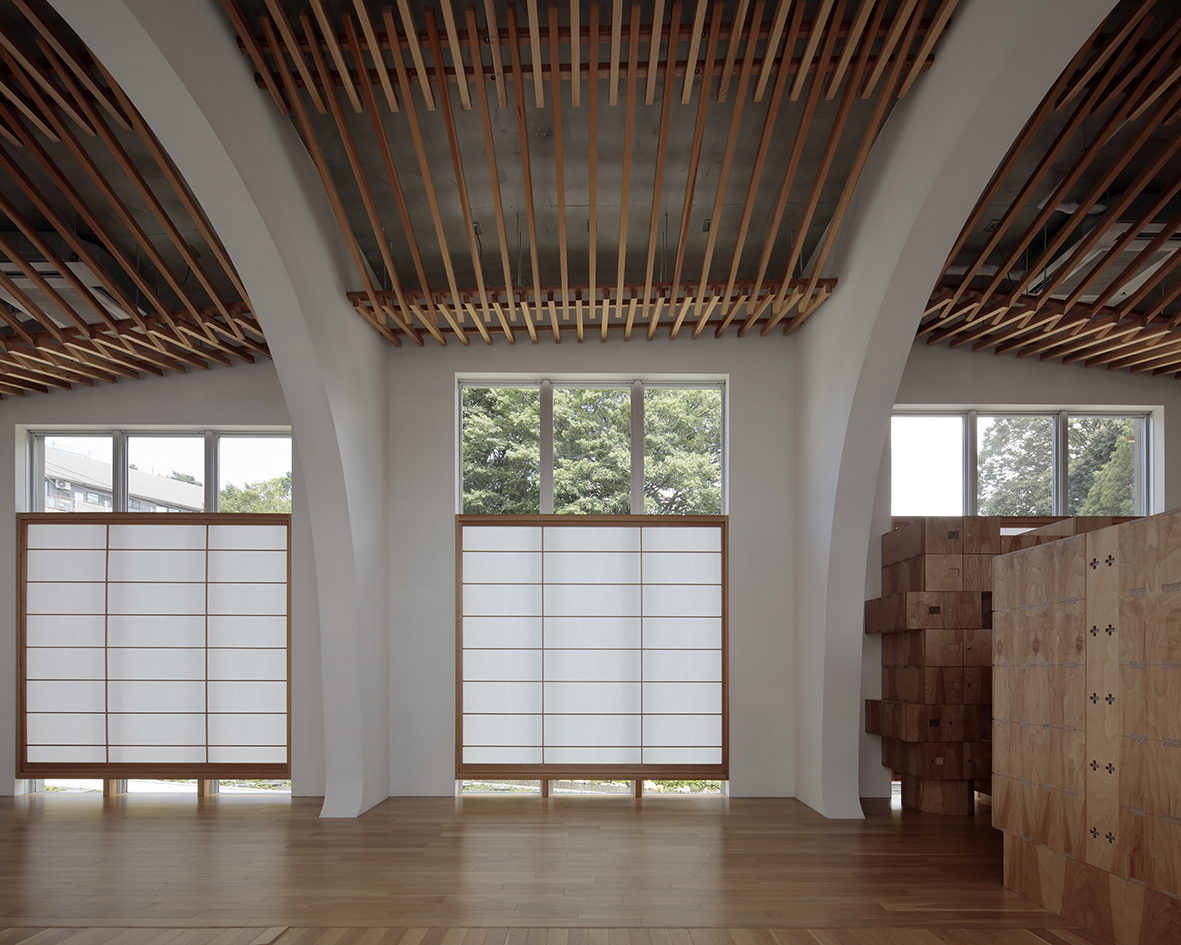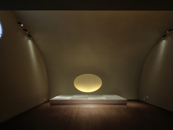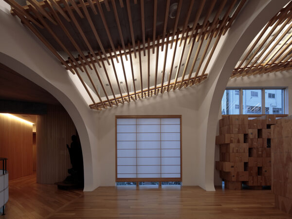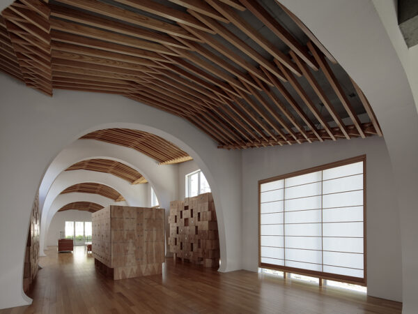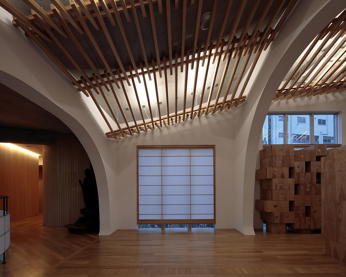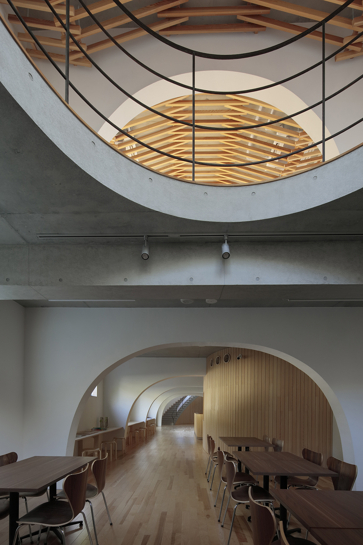 曲面をもつリニアな外形の中に、アーチ形開口のある耐力壁を等ピッチで配置し、この建物内の空間を分節し接続する。アーチを通過するたびに空間の異なりを感じることが、人間の死と切り離すことができないこの建物にふさわしいと考えた。納骨堂は屋根の曲面に応じた高低差に富む天井の空間性が確保できるが、屋根勾配と直行方向に設けた木製ルーバーがさらに助長している。